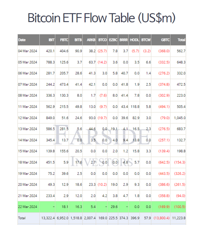 금융정보 플랫폼 파사이드 인베스터(Farside Investors) 데이터에 따르면 22일(이하 현지시간) 그레이스케일의 비트코인 현물 ETF(GBTC)에서 1억 6,990억 달러 상당 자금이 순유출됐다.