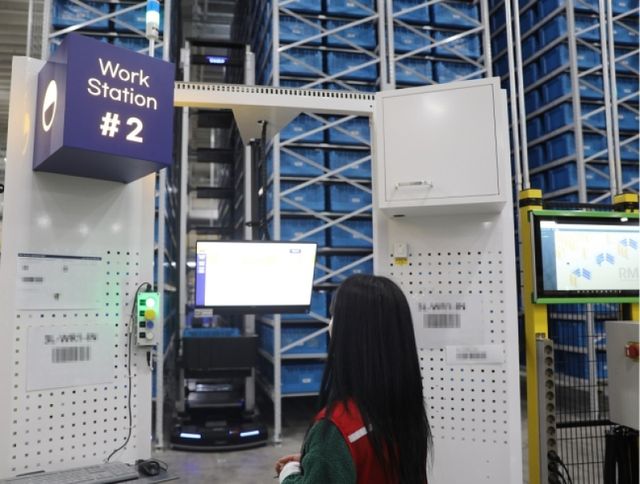 바닥부터 천장까지 설치된 랙상품 적재 공간을 위아래로 오르내리는 '로보셔틀' 로봇이 상품을 담은 여러 상자를 특정 장소에 옮기면 대기 중인 '소형 피킹 로봇'이 작업자에게 전달해주는 방식이다.