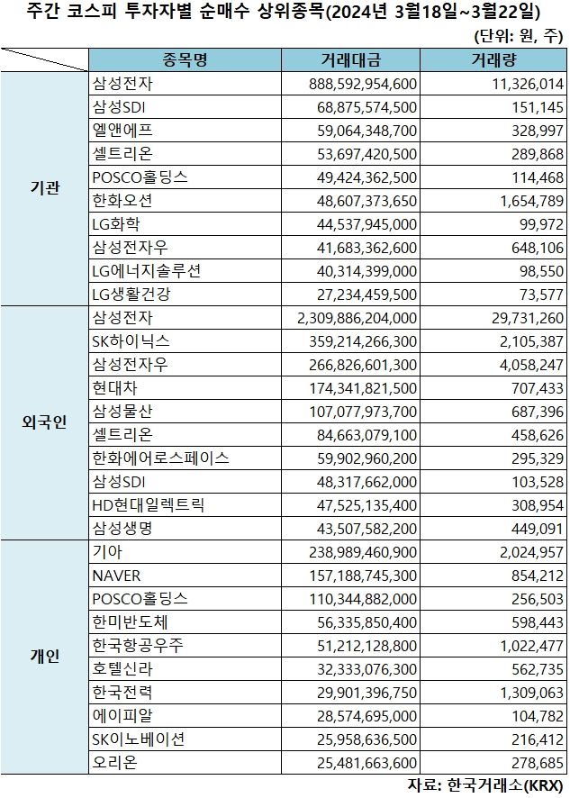 기관 '삼성전자'·외인 '삼성전자'·개인 '기아' 1위 [주간 코스피 순매수- 3월18일~3월22일]