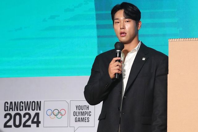 윤성빈이 2023년 7월 6일 서울 송파구 올림픽파크텔에서 열린 2024 강원 동계 청소년올림픽 대회 G-200 계기 출정 행사에서 발언하고 있다. / 뉴스1