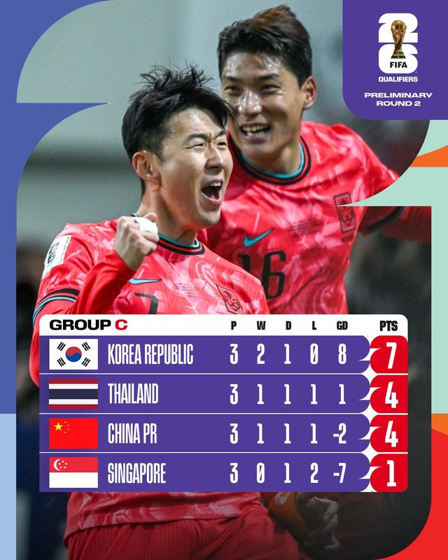 한국은 3차전에서 승점 1점을 나눠 가지는 데 그쳤다. 한국은 일단 조 선두(2승 1무 승점 4)를 유지했고 태국은 조 2위(1승 1무 1패 승점 4)로 올라섰다. 중국이 싱가포르와의 3차전에서 2-2로 비겼고 골득실에서 중국(-2)이 태국(+1)에 밀렸다.