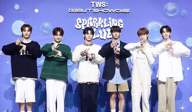 투어스(TWS)가 서울 용산구 블루스퀘어에서 열린 데뷔앨범 '스파클링 블루'(Sparkling Blue) 발매 기념 쇼케이스에서 포즈를 취하고 있다. / 연합뉴스