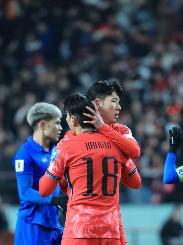 손흥민과 이강인은 26일 오후 9시 30분(한국시간) 태국 방콕의 라자망갈라 스타디움에서 열리는 태국과의 2026 국제축구연맹(FIFA) 북중미 월드컵 아시아 2차 예선 C조 4차전 출격을 준비 중이다. 이강인이 교체로 출전해 서로 호흡을 맞출 시간이 적었던 지난 21일 3차전과 달리 이날은 나란히 선발로 출전하는 게 유력하다. 소속팀 일정 탓에 귀국이 가장 늦었던 이강인은 서울월드컵경기장에서 열린 지난 경기에선 30여 분만 뛰었다.