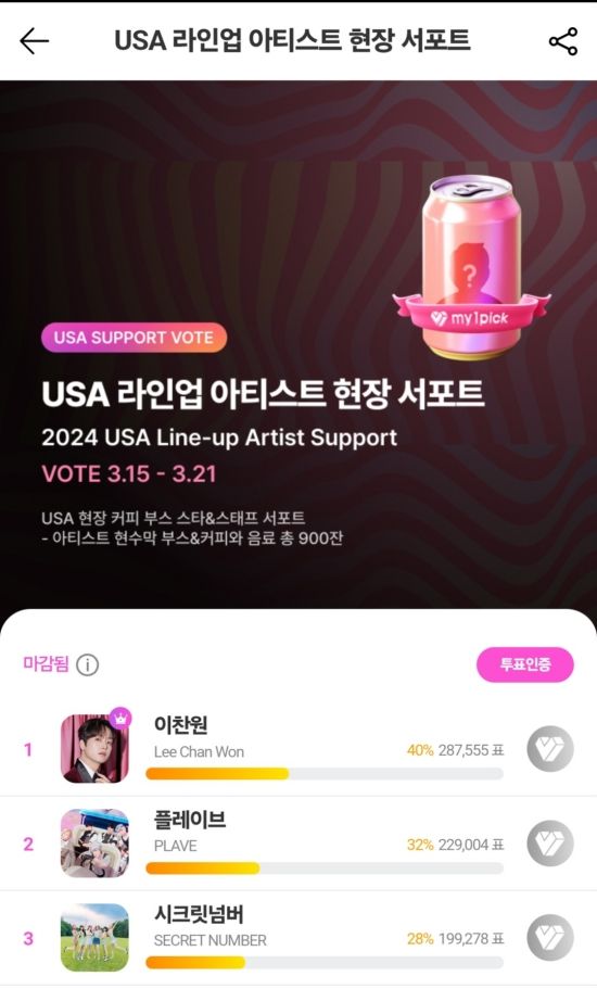'마이원픽' 앱에서는 3월 15일부터 21일까지 'USA 라인업 아티스트 현장 서포트' 투표가 열렸다. 이는 USA 현장에 아티스트의 현수막이 설치된 커피 부스를 제공하고, 이를 통해 스타와 스태프에게 커피와 음료 총 900잔을 서포트하는 투표이다.