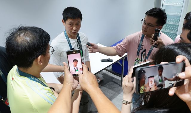 이영표 축구 해설위원이 지난 25일 태국 방콕 라자망갈라 스타디움 기자실에서 2026 북중미 월드컵 아시아 지역 2차 예선 C조 4차전 한국-태국전 공식 기자회견을 기다리던 중 태국 취재진의 질문에 답하고 있다. / 연합뉴스