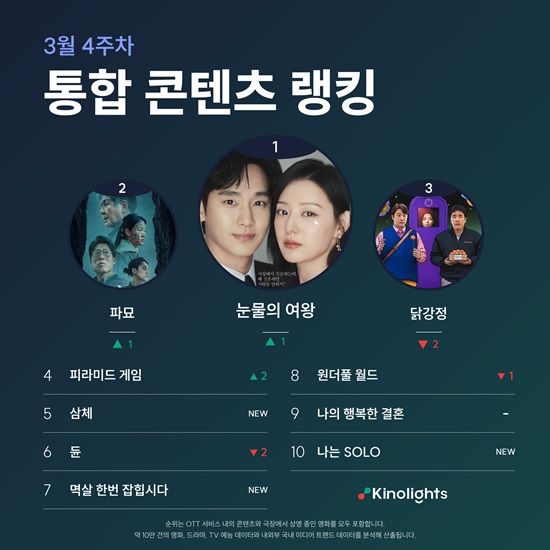 (엑스포츠뉴스 조혜진 기자) '눈물의 여왕'이 방송 3주 만에 통합 콘텐츠 랭킹 1위를 차지했다.