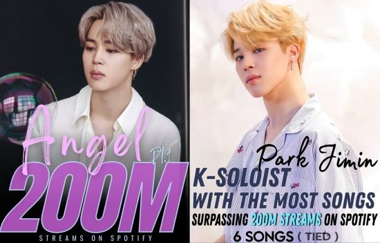 지민은 '엔젤 파트1' 외에도 '라이크 크레이지' 원곡과 영어곡, '셋 미 프리 파트2', '바이브', tvN 드라마 OST '위드 유', 방탄소년단 앨범에 수록된 솔로곡 '라이', '세렌디피티', '필터' 등 다수의 2억 스트리밍 돌파 곡을 보유하고 있다.