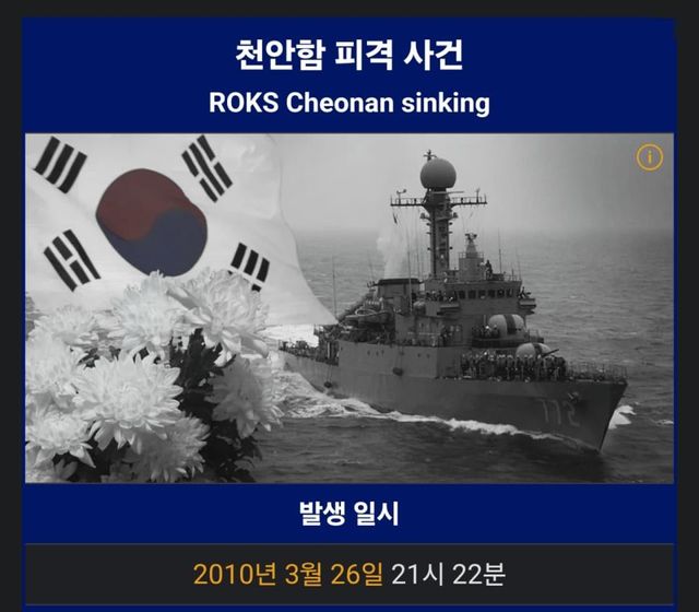 2010년 3월 26일(금) 21:22경 백령도 인근 해상에서 정상적인 임무수행 중이던 해군 2함대 소속 천안함(초계함)이 북한의 어뢰공격에 의해 침몰되었으며, 승조원 104명 중 46명이 전사하고 58명은 생존하였다.