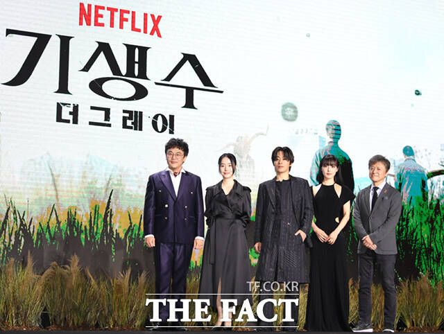[더팩트ㅣ이새롬 기자] 배우 김인권과 이정현, 구교환, 전소니, 권해효(왼쪽부터)가 26일 오전 서울 용산구 서울드래곤시티에서 열린 넷플릭스 시리즈 '기생수: 더 그레이' 제작발표회에 참석해 포즈를 취하고 있다.