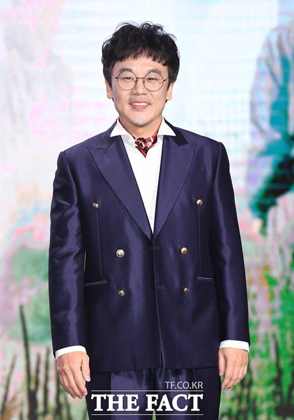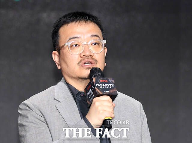 연상호 감독이 26일 오전 서울 용산구 서울드래곤시티에서 열린 넷플릭스 시리즈 '기생수: 더 그레이' 제작발표회에 참석해 발언하고 있다.