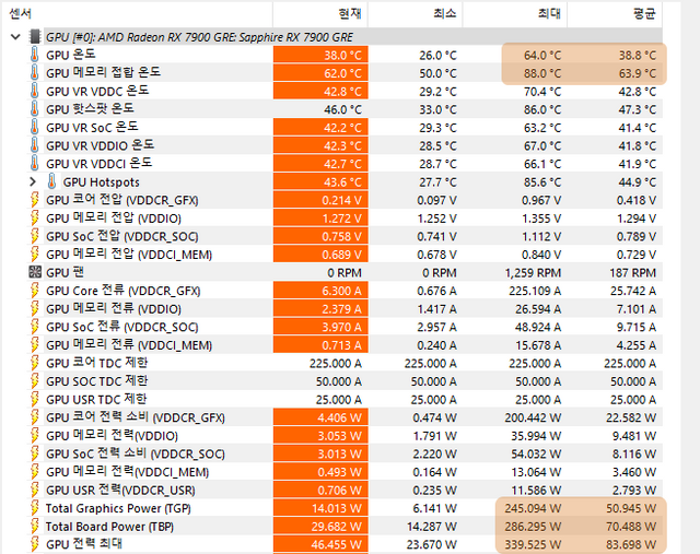 ▲ 전력 소모가 최대 339W까지 올라가지만 그럼에도 불구하고 소모량 대비 온도는 평균 38.8도로 안정된 모습이다. 3열 팬과 히트파이프 여기에 백플레이트 조합의 냉각 솔루션이 최상의 냉각 효율을 발휘한 효과다.