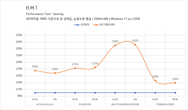뭐 RX 7900 GRE야 이렇게 포진된 것이 조금 서러울 수 있겠지만, 대다수의 게이머들에게는 잘 된 일이다. 분명 성능 좋은 RX 7900 시리즈인데, 가성비를 앞세워 비교적 저렴하게 구입할 수 있으니까. AMD 공식 자료에 의하면 배틀그라운드 평균 FPS 기준으로는 RX 7600 XT가 168, RX 7900 GRE가 282, RX 7900 XT 20GB가 334 프레임으로 측정된다고 한다. RX 7900 GRE는 분명 RX 7900 XT에 가깝다.