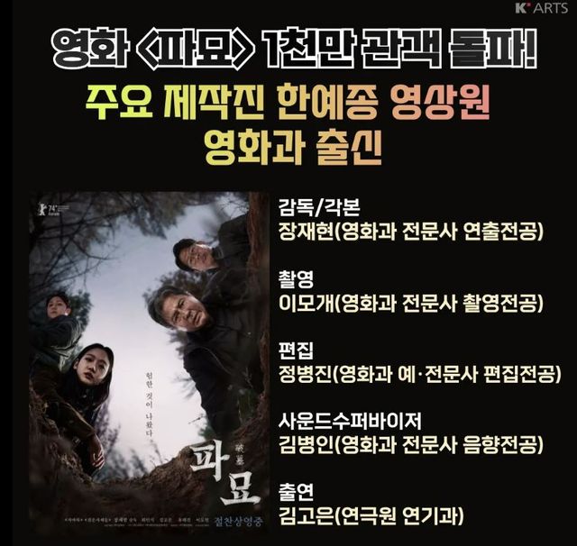 (엑스포츠뉴스 김예은 기자) 영화 '파묘'(감독 장재현)의 천만 관객 돌파에 한국예술종합학교(이하 한예종)도 자랑에 나섰다.