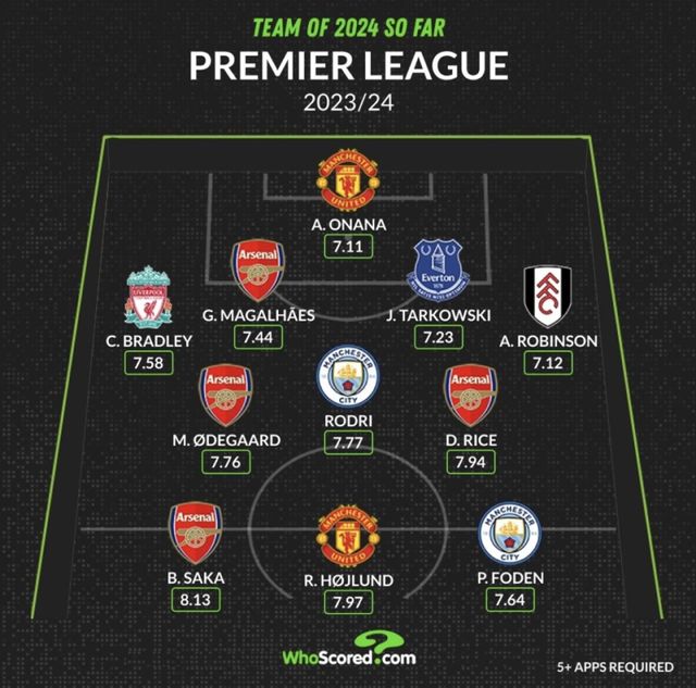 축구 통계 매체 후스코어드는 27일(한국시간) 2024년 EPL 올해의 팀을 공개했다. 2023~24시즌이 기준이 아닌, 2024년 1~3월 사이 활약을 토대로 베스트11을 꾸린 것이다. 매체는 이 기간 각 포지션별로 평점이 가장 높은 선수들에게 자리를 할애했다.