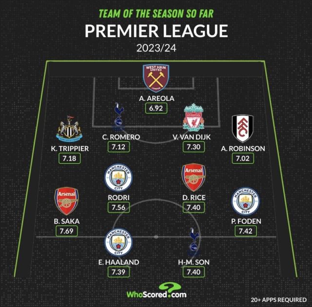후스코어드는 최근 올 시즌 전체를 두고 평가해 뽑은 EPL 올해의 팀을 공개했다. 이번 베스트11과는 사뭇 달랐다. 손흥민, 홀란 등이 포함됐다. 사카, 포든, 라이스, 로드리 등은 올 시즌 전체, 2024년 1~3월 베스트11에 모두 이름을 올렸다.