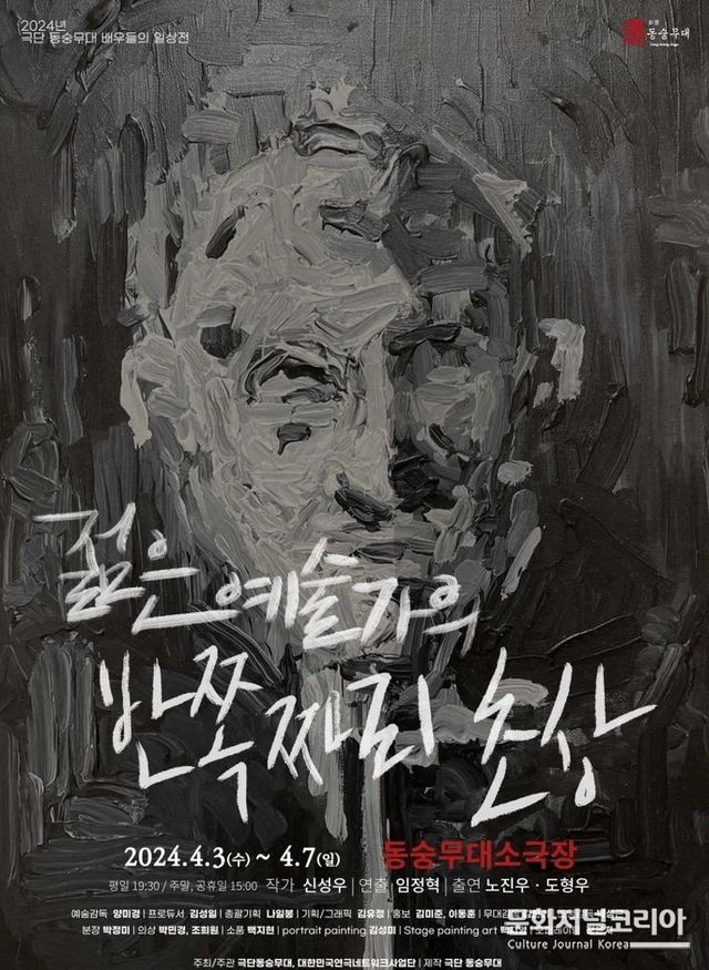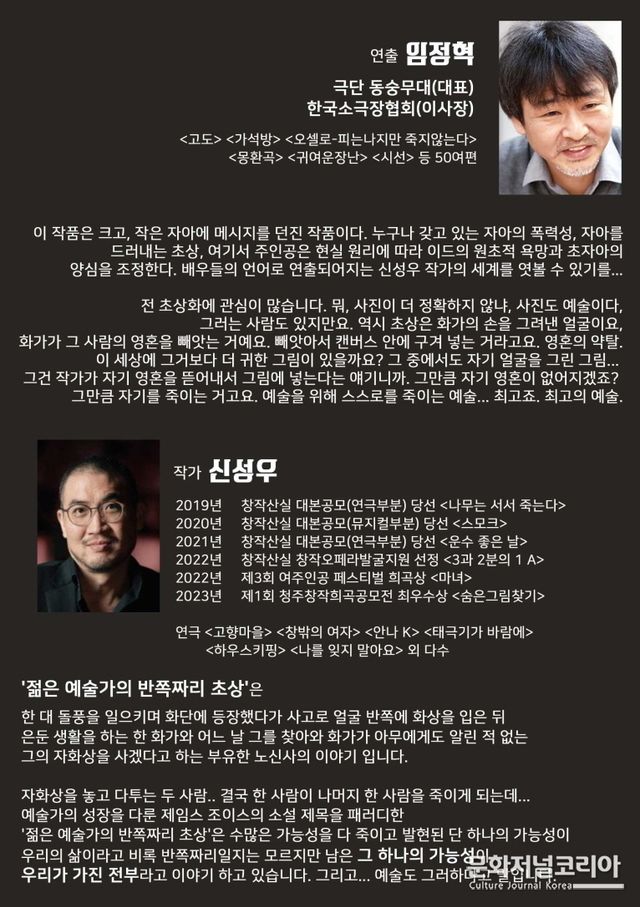 문화저널코리아 김영일 기자 | 예술가의 성장을 다룬 아일랜드 더블린 출신 제임스 조이스의 1917년 소설 ‘젊은 예술가의 초상 ’의 제목을 패러디하여 쓴 연극‘젊은 예술가의 반쪽짜리 초상’이 2024년 극단 동숭무대 배우들의 일상전으로 대학로 실력파 배우로 알려진 노진우와 도형우가 대학로 무대를 설레이게 하고 있다