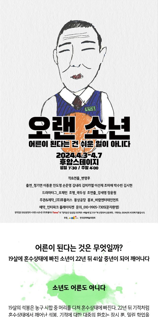 연인, 친구, 가족, 어떤 조합으로도 즐겁게 볼 수 있는 <오랜 소년>은 2024년 4월 3일부터 4월 7일까지 대학로 후암스테이지에서 공연하며 인터파크와 플레이티켓에서 예매가 가능하다.