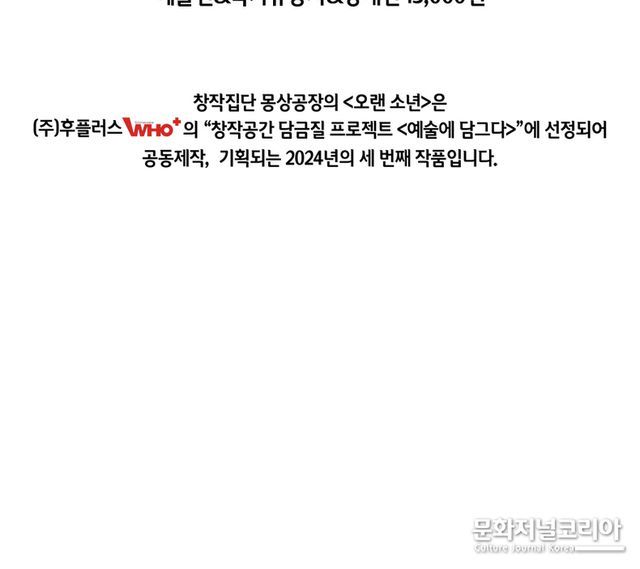 <오랜 소년>은 초연작으로 ㈜후플러스의 ‘창작 공간 담금질 프로젝트 <예술에 담그다>’에 선정되어 공동제작 및 기획되는 2024년의 세번째 작품이다. 우수 작품 공연의 레퍼토리화를 목표로 진행되고 있는 ‘창작 공간 담금질 프로젝트 <예술에 담그다>’에 선정된 만큼 공연의 높은 수준과 대중성은 이미 검증됐다는 후문이다.