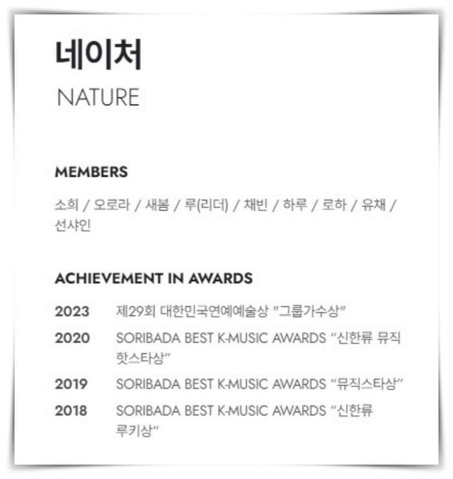 한편 네이처는 2018년 8월 가요계에 데뷔한 n.CH엔터테인먼트 소속 9인조 걸그룹이다.