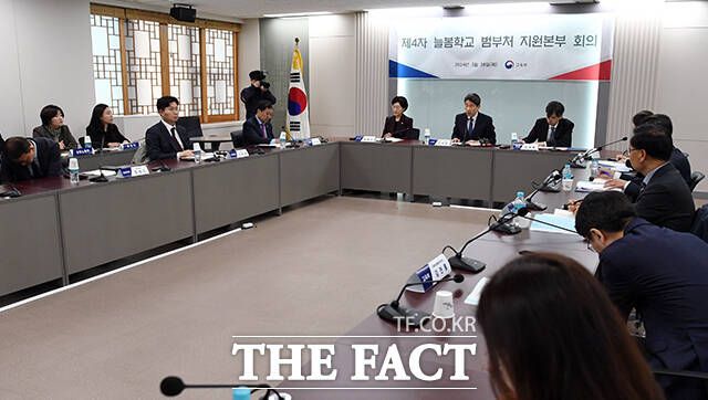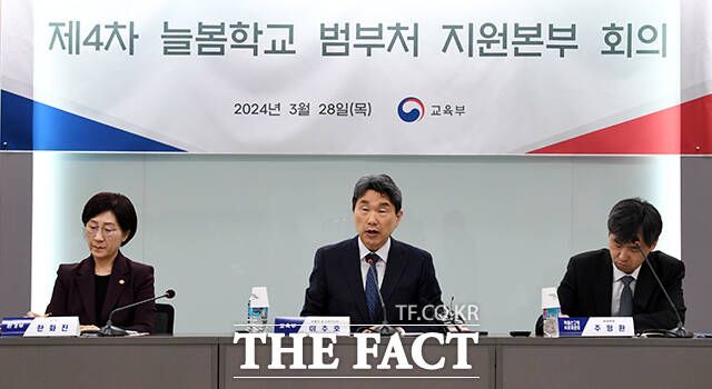[더팩트ㅣ임영무 기자] 이주호 사회부총리 겸 교육부 장관(오른쪽 두번째)이 28일 오전 서울 종로구 정부서울청사에서 열린 제4차 늘봄학교 범부처 지원본부 회의에 참석해 모두발언을 하고 있다.