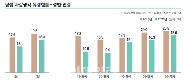 28일 보건복지부가 공개한 ‘2023 자살실태조사’ 결과에 따르면 평생 한 번이라도 자살생각을 해 본 적이 있는 사람(자살생각 유경험자)은 14.7%로 나타났다.