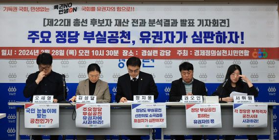 김성달 경실련 사무총장은 “거대 양당 후보들의 전과 비중과 전체 후보자 평균 재산이 크게 늘었다”면서 “재산도 많고 전과 기록도 많은 사람들이 국회의원이 되겠다고 공천 받는 것에 대해 국민은 눈높이에 맞다고 동의하지 않을 것이고, 각 정당은 이번 선거에서도 부실 공천 비판을 피할 수 없을 것”이라고 비판했다.