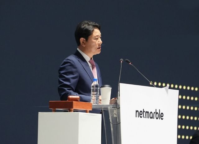 권영식 넷마블 대표이사가 28일 서울 구로구 지타워 컨벤션홀에서 열린 제13기 정기 주주총회에서 발언하고 있다. 사진=넷마블 제공