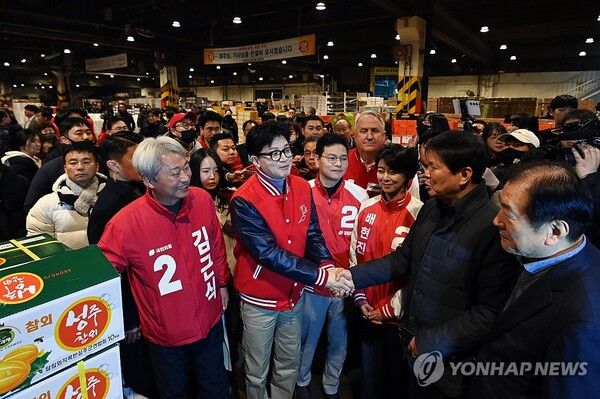 한동훈, 가락시장서 선거운동 시작 "생활인 대변하는 정당" "범죄 세력 심판"