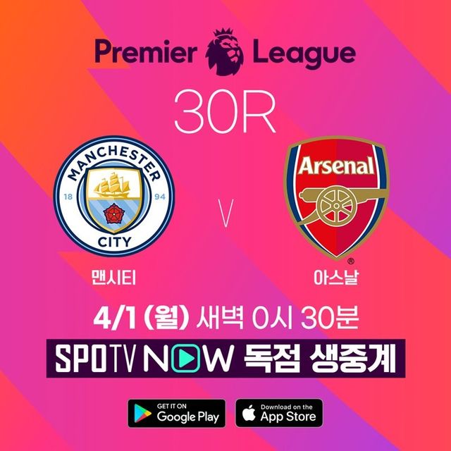 맨시티와 아스날의 PL 30R 경기는 4월 1일 월요일 새벽 0시 30분 TV 채널 스포티비 프라임(SPOTV Prime)과 스포츠 OTT 서비스 스포티비 나우(SPOTV NOW)에서 독점 생중계된다.