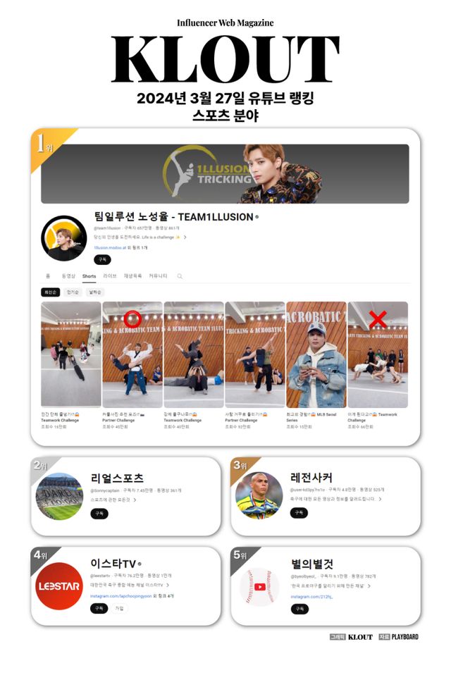 유튜브 순위 조회 사이트 플레이보드에 따르면 팀일루션 노성율은 지난 27일 조회수 791만 회를 돌파하며 스포츠 유튜버 정상을 차지했다. 지난 26일 업로드된 '강제 물구나무 시도'와 '커플사진 포즈 추천' 영상은 각각 40만 회, 45만 회의 높은 조회수를 기록하며 뜨거운 반응을 얻었다.