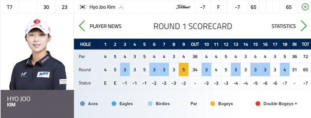 김효주는 이날 버디 8개, 보기 1개로 7언더파 65타를 쳐 셀린 부티에(프랑스)와 공동 7위에 올랐다. 선두와는 2타 차다.
