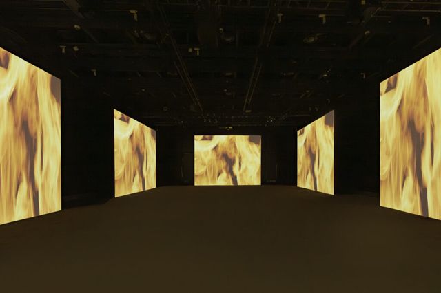 전시와 동일한 이름을 한 <번 투 샤인(burn to shine)>(2022)은 프랑스계 모로코인 안무가 푸아드 부수프(Fouad Boussouf)와 협업으로 진행된 퍼포먼스 영상으로, 아프리카 마그레브 지역의 전통 의식과 현대무용을 결합해 강렬한 사운드와 다채로운 움직임으로 색다른 감각을 선사합니다. 12명의 타악기 연주자와 18명의 무용수가 등장해 불꽃을 둘러싼 채 춤을 추며 신비로운 황홀경을 자아냅니다. 영상은 무한 반복되며 영상 속 이들의 의식과도 같은 움직임은 불꽃이 타버리고 해가 뜨며 막을 내리다 다시 밀려오는 어둠과 함께 다시 시작되므로써 삶에 대한 축제이자 애도를 담아내며 삶과 죽음의 연약한 경계를 탐색합니다.