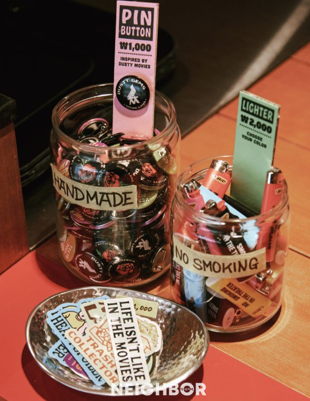 공간을 살펴보면 1층의 매표소와 매점, 기념품 숍, 2층 라운지, 3층 상영관과 4층 루프톱으로 구성된다. 어느 층이건 이야기가 넘실댄다. 매점에는 팝콘과 핫도그, 추러스 등 스낵과 프츠 커피가, 기념품 숍에는 작은 핀 배지 및 스티커부터 티셔츠, 머그컵 등 사랑스러운 굿즈가 가득하다. 2층은 앉아서 쉬거나 영화 책을 들춰볼 수 있는 휴식 공간이다. 이른바 ‘헤비 스포일러’를 위한 곳으로, 입술을 닮은 벤치와 세라믹 월의 나팔 부는 새가 수다를 부추긴다. 진열장의 오브제도 사연 없는 물건이 없다. 오키나와에서 가져온 돌, 영화 <2001 스페이스 오디세이> 속 우주선을 모티프로 한 세라믹 볼, 상영하고 싶은 영화의 아트워크로 채운 도자기 등 물건만으로 이야기의 물꼬를 틀 만하다.