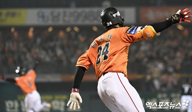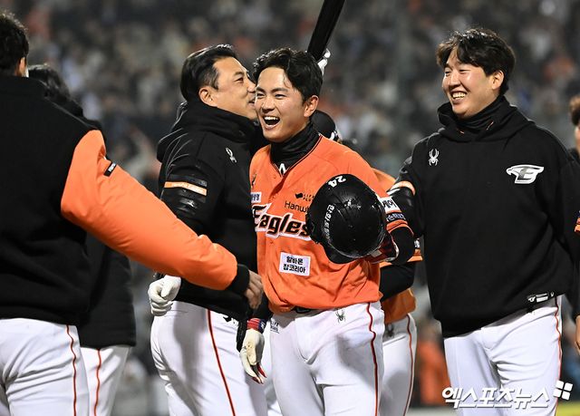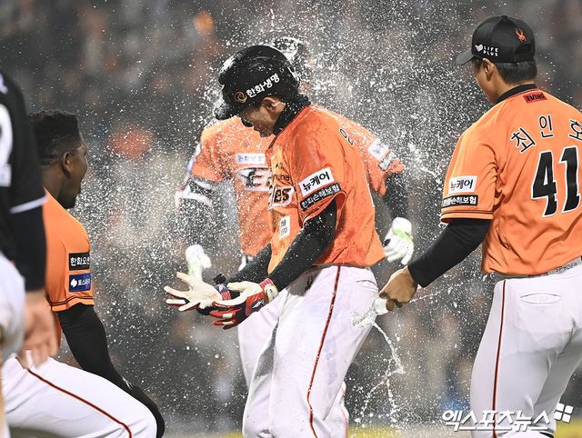 "야구를 하면서 끝내기를 쳐본 게 처음이다. 기분이 좋다"고 끝내기 소감을 전한 임종찬은 "물이 생각보다 차가웠다"고 미소를 보였다.
