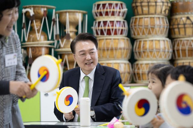 윤석열 대통령이 지난 21일 강원도 원주시 명륜초등학교의 늘봄학교 ‘초1 맞춤형 프로그램’에 참여해 아이들과 소고를 함께 연주하고 있다. (사진=연합뉴스)