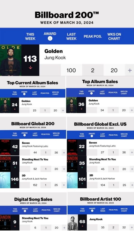 'GOLDEN' 앨범은 '톱 커런트 앨범' 차트에서 24위, '톱 앨범 세일즈' 차트에서 36위에 각각 20주째 랭크됐다. 그리고 정국의 솔로 싱글 'Seven', '3D', 'Standing Next to You'는 빌보드 '글로벌 200'과 '글로벌(미국 제외)' 차트에서 각각 36주, 25주, 20주 연속으로 차트에 이름을 올렸다.
