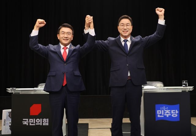 29일 오후 제주시 JIBS제주방송에서 선거관리위원회 주최 제22대 국회의원 선거 서귀포시 후보자 토론회 시작에 앞서 더불어민주당 위성곤 후보(오른쪽)와 국민의힘 고기철 후보가 포즈를 취하고 있다. 연합뉴스