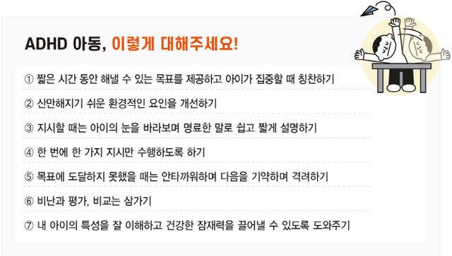 산만한 아동은 부모가 격려하며 함께 숙제나 공부하는 것만으로도 문제 행동이 줄어들기도 한다. 이와 함께 또래보다 짧은 시간 동안 무언가 해 낼 수 있도록 환경을 제공하고 집중하는 모습을 칭찬하면서 아이가 기쁜 마음으로 노력할 수 있게 하는 것이 좋다. 중요한 것은 빠른 치료 시기이다. 의심 증상이 있으면 시간을 끌지 말고 조속히 전문 의료진을 찾아 치료받는 것이 필요하다.