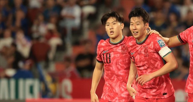 2024년 3월 26일 태국 방콕 라자망갈라 스타디움에서 열린 2026 북중미 월드컵 아시아 지역 2차 예선 C조 4차전 한국과 태국의 경기에서 후반전 골을 넣은 손흥민이 이강인과 기뻐하고 있다. / 연합뉴스