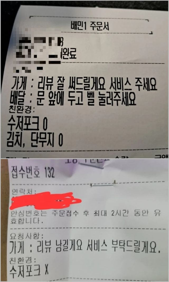 B 씨가 첨부한 주문서에도 "리뷰 남길게요. 서비스 부탁드릴게요"라는 손님의 요청이 적혔다.