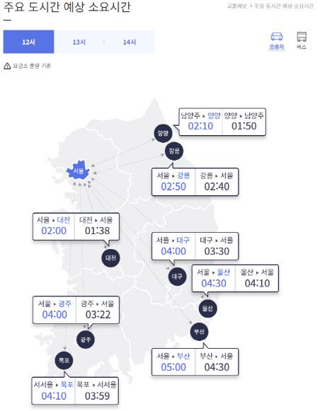 오전 12시 요금소 기준 주요 도시간 예상 소요시간은 △서울→대전 2시간 △대전→서울 1시간 38분 △서울→강릉 2시간 50분 △강릉→서울 2시간 40분 △서울→대구 4시간 △대구→서울 3시간 30분 △서울→광주 4시간 △광주→서울 3시간 22분 △서울→울산 4시간 30분 △울산→서울 4시간 10분 △서서울→목포 4시간 10분 △목포→서서울 3시간 59분 △서울→부산 5시간 △부산→서울 4시간 30분이다.