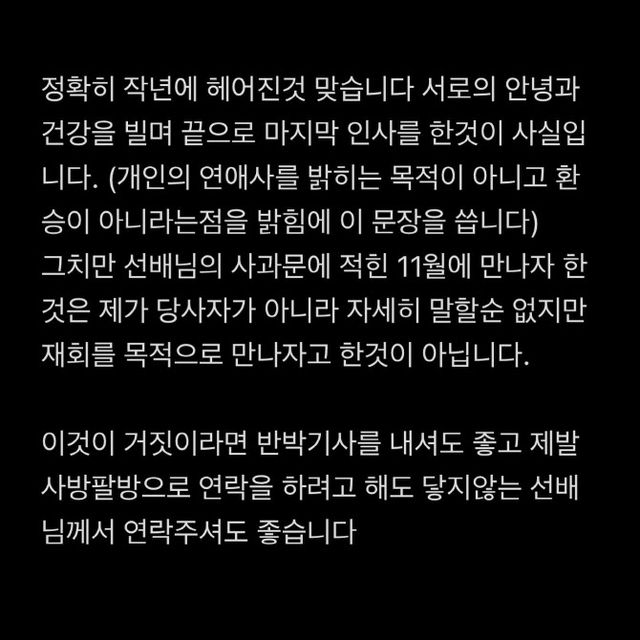 이어 자신을 둘러싼 환승연애 논란에 또다시 해명하며 “(혜리와 류준열은) 정확히 작년에 헤어진 것 맞다”고 못박았다. 또 류준열의 전 연인 혜리를 향해 “헤어진 연인에게 여자친구가 생긴 점에 뭐가 그렇게 재밌었는지 묻고 싶다”고 덧붙였다.