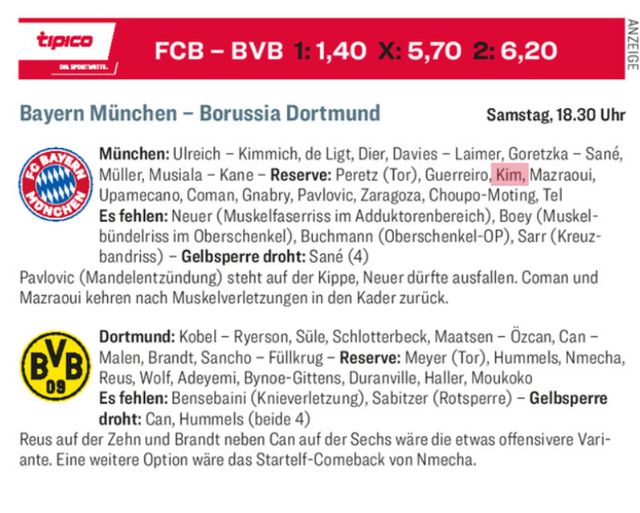 독일 축구매체 키커는 31일 오전 2시 30분(한국시간) 독일 뮌헨의 알리안츠 아레나에서 열리는 2023~24 독일 분데스리가 27라운드 바이에른 뮌헨과 보루시아 도르트문트의 예상 선발 라인업에 김민재의 이름을 제외했다. 앞선 3경기와 마찬가지로 마테이스 더리흐트와 에릭 다이어가 선발로 중앙 수비진을 구축하고, 김민재는 또 다른 센터백 다요 우파메카노와 교체 출전을 투입할 거란 예상이다.