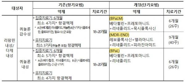 이에 질병청은 단기요법에 사용되는 약제의 급여기준을 개선해 내달 1일부터 요양급여를 적용하기로 했다. 단 요양급여를 적용받으려면 질병청 ‘다제내성결핵 치료 신약 사전심사’를 통해 승인받아야 하며 자세한 신청 및 절차는 사전심사 안내서*를 통해 확인할 수 있다.