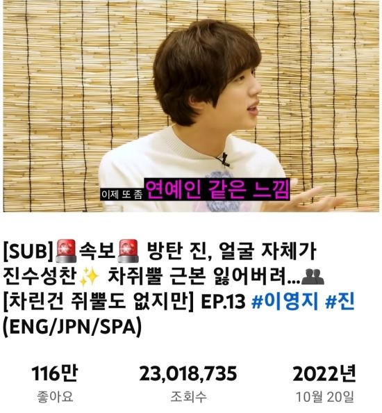 지난 2022년 10월 20일 '차린건 쥐뿔도 없지만'(차쥐뿔) 채널에는 "속보 방탄 진, 얼굴 자체가 진수성찬. 차쥐뿔 근본 잃어버려..."라는 제목의 영상이 게재됐다.