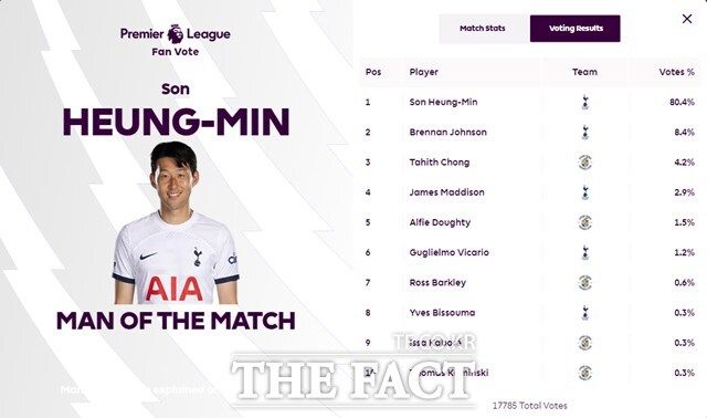 EPL 공식 홈페이지는 경기 직후 17,785명이 참여한 팬투표에서 80.4%의 압도적 지지를 받은 손흥민을 MOM으로 선정했다. 후반 교체 투입돼 활발한 활약을 보인 브레넌 존슨이 8.4%의 지지를 받아 2위를 기록했다. 축구 통계 매체 '풋몹'은 손흥민에게 평점 8.4점을 부여하며 경기 최우수 선수(MOM)로 선정했다. '후스코어드닷컴'도 양팀 통틀어 유일한 8점대인 8.2점을 부여하며 MOM에 손흥민을 올렸다. 다른 현지 외신들도 이견 없는 최우수선수로 손흥민은 꼽았다.