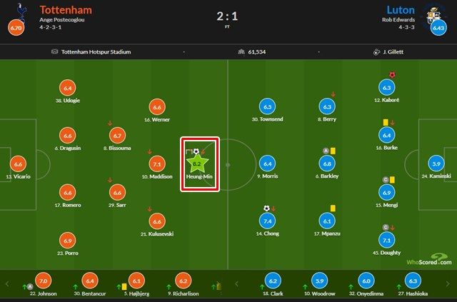 토트넘-루턴 타운 경기에서 '후스코어드닷컴'의 최고 평점을 받은 손흥민(붉은 네모)./후스코어드닷컴