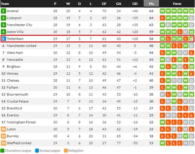 손흥민의 역전 결승골로 잠시 4위에 올랐던 토트넘은 아스톤 빌라 역시 승리를 거두며 다시 5위를 기록하고 있다./후스코어드닷컴