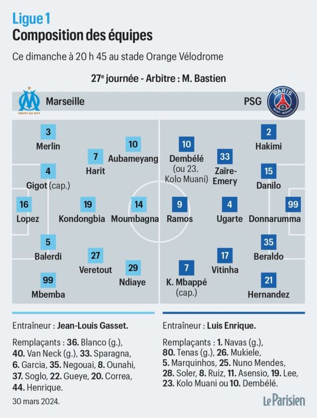 한편 프랑스 매체 르 파리지엥은 31일 마르세유-PSG전의 예상 선발 명단을 공개하면서 이강인의 이름을 벤치에 포함했다. 매체는 음바페·곤살루 하무스·우스만 뎀벨레(혹은 랑달 콜로-무아니)가 전방을 맡고, 비티냐·마누엘 우가르테·워렌 자이르-에머리가 중원을 구성할 것이라 내다봤다. 백4는 뤼카 에르난데스·루카스 베랄두·다닐루 페레이라·아치라프 하키미, 골키퍼는 잔루이지 돈나룸마다.