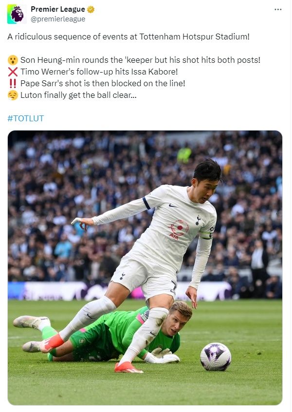 PL은 공식 SNS 계정에 "토트넘 홋스퍼 스타디움에서 믿을 수 없는 장면이 나왔다! 손흥민이 골키퍼를 제치고 슈팅했지만 양쪽 골대를 강타했다. 베르너의 슈팅은 카보레에게 맞았다. 사르의 슈팅은 수비에게 막혔다. 그리고 루턴이 공을 걷어냈다"라며 해당 장면을 돌아봤다.